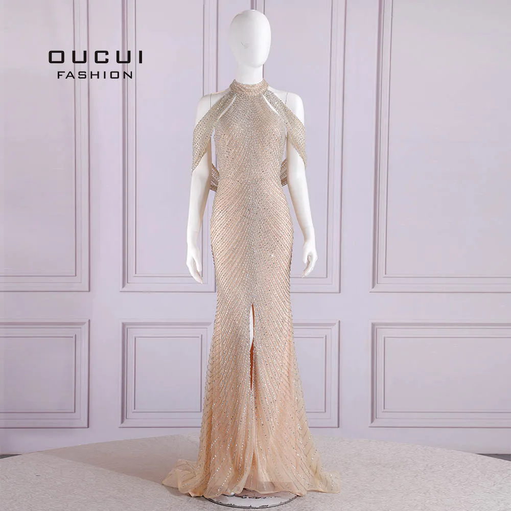 Addition Information of Luxury Dubai Women Evening Dresses Long Fully Beaded Sexy Halter Backless Slit Champagne Party Prom Dress Gowns OL103712