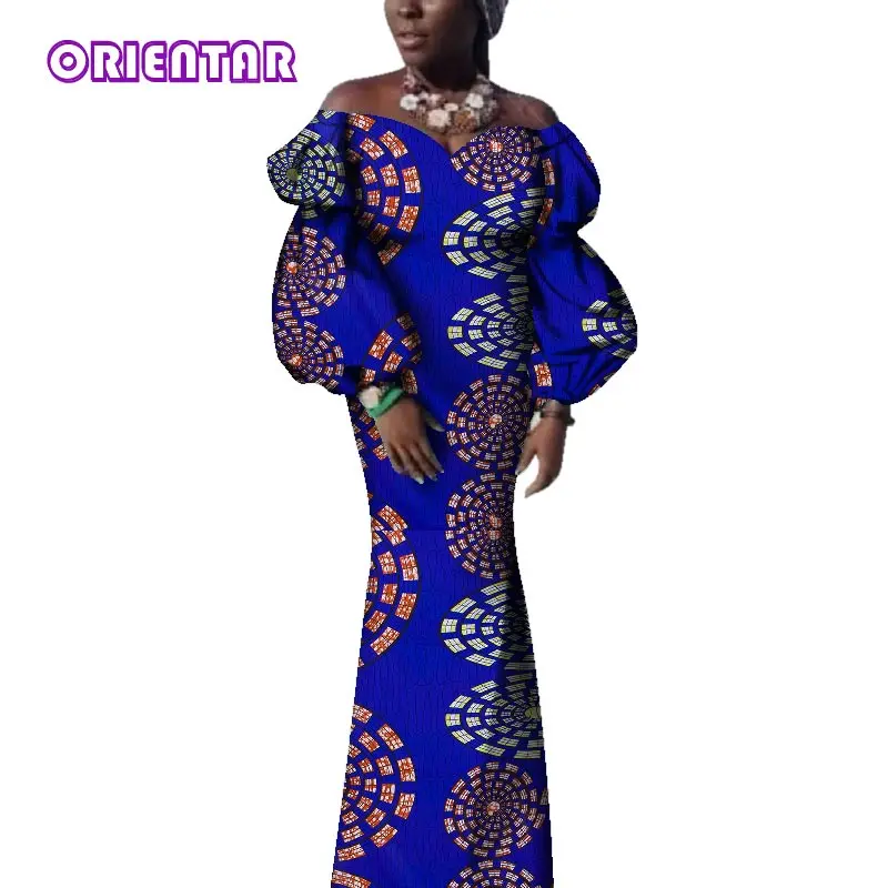 Bazin Riche African Dresses for Women Off Shoulder Puff Sleeve Ankara Dress African Wax Print Long Party Evening Dress WY3715