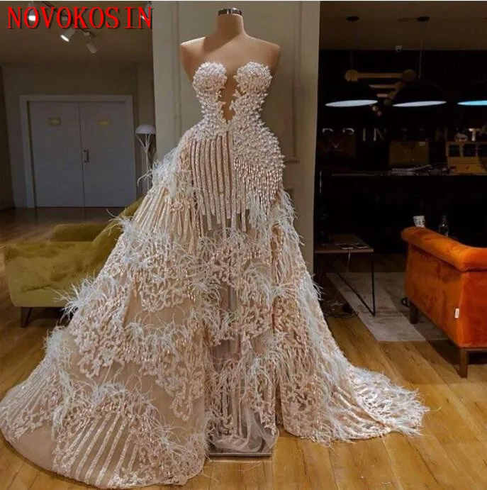 Splendid Evening Dress With Detachable Train Sweetheart Major Beading Feather Appliqued Sequins Formal Party Gowns Prom Dresses