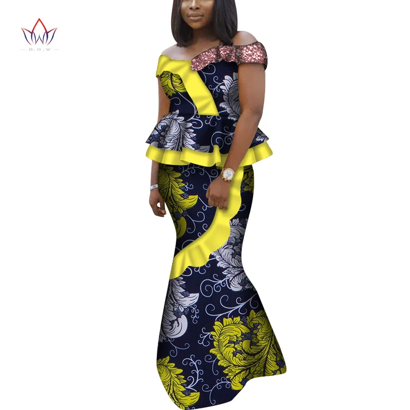 African Short Sleeves Print Tops and Skirt Sets for Women Bazin Riche African Clothing 2 Pieces Skirt Set Off Shoulder WY6802