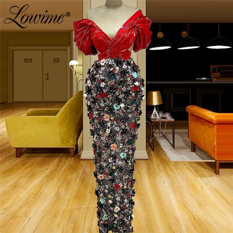 Lowime Dubai Evening Dress 2021 Robes V-Neck Handmade with Flowers Arabic Formal Party Gown Long Prom Dresses Vestidos Festa