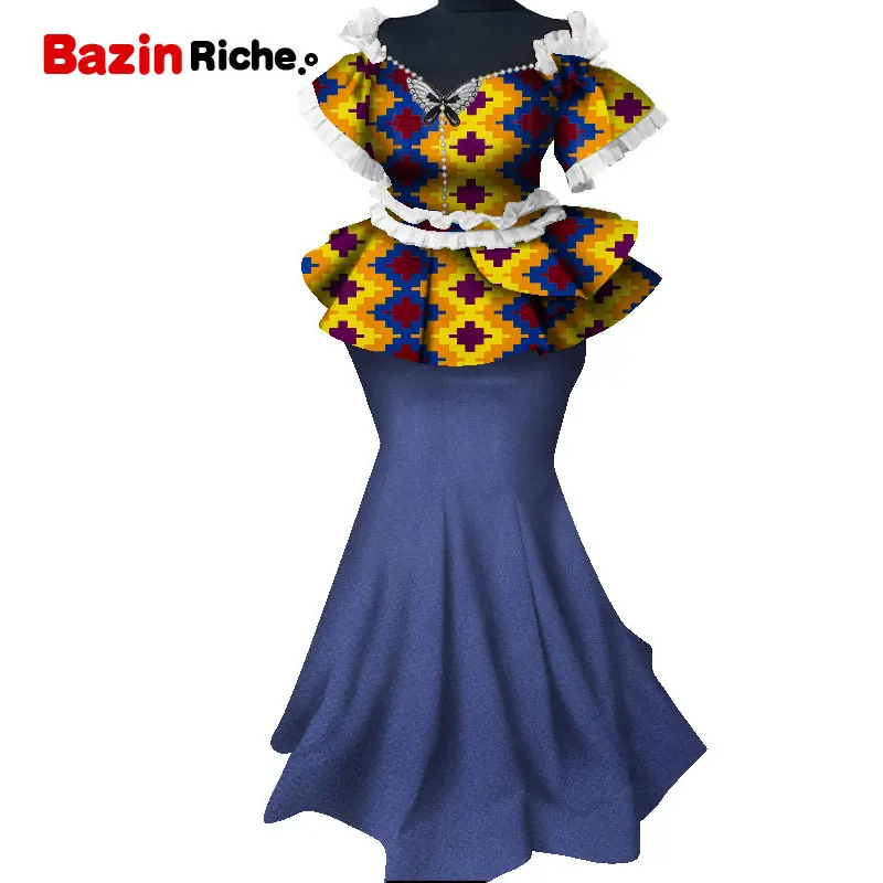 2021 New African Long Print Skirt Maxi Dress Suit Half Sleeve Crops Tops Splice Dress Bazin African Clothing for Women WY1417
