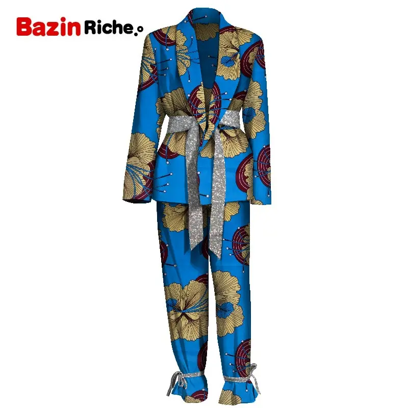 African Women Dress Pant Suit Gliter Waist Belt Decoation Print Blazer Sets Fashion Lady Part Street Beautiful Wear WY8619