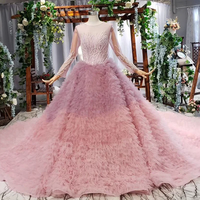 Cheap Price for BGW 2020 Pink Evening Dress Long O-neck 3D Flowers Long Sleeves Bridal Wedding Party Dress Gown Cake Style Vestito Da Sera Lungo