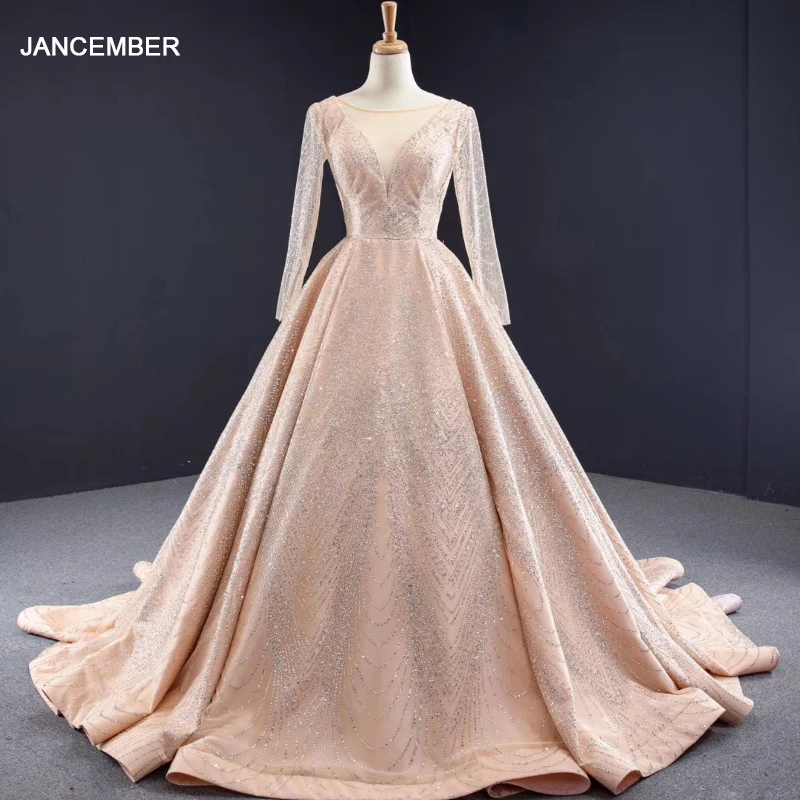 J67066 jancember long evening dresses with sleeves o neck sequined lace gold elegant dress with train платье вечернее длинное