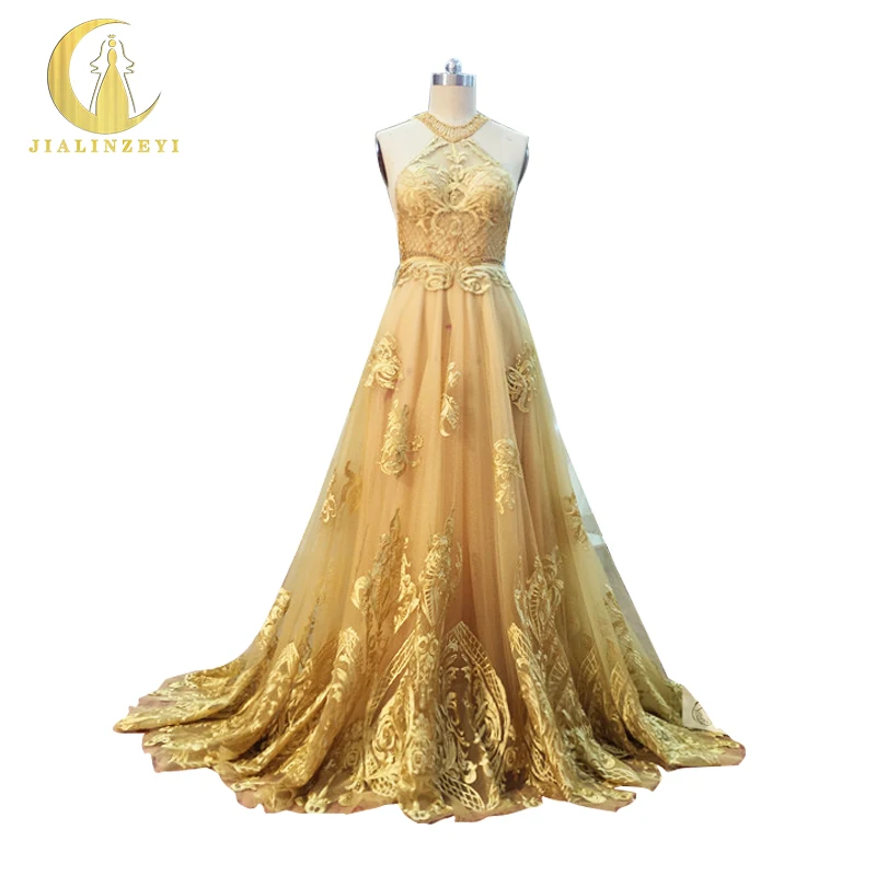 JIALINZEYI New Sexy Halter Gold Lace Embroidery See Through A-line Backlless Formal Dresses Party Evening Dresses 2020