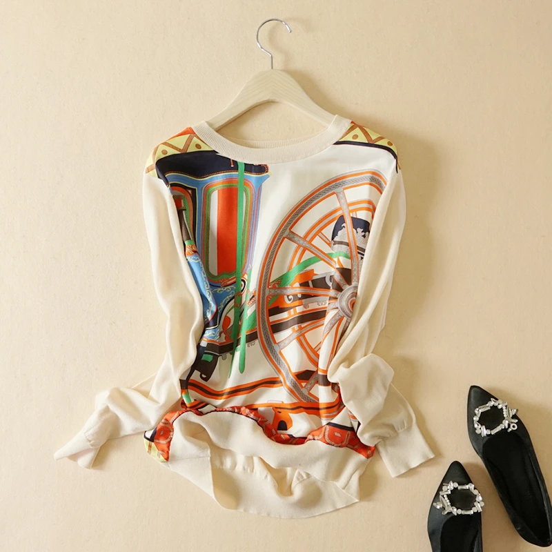Buy New fashion foreign style craft printed satin silk stitching knitted round neck thin bottomed top and You will Save USD 0 or 0% %, Because You Just Pay for 78.00 not Full Price for 78.00