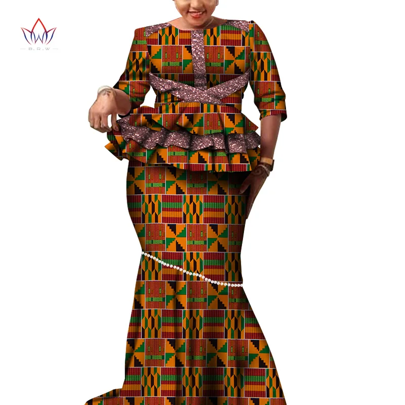 African Long Sleeves Print Tops and Skirt Sets for Women Bazin Riche African Clothing 2 Pieces Skirt Set Peals Customize WY6113