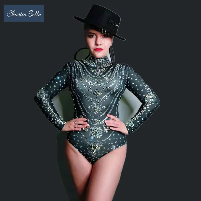 Sparkly Rhinestones Elastic Long Sleeve Bodysuit Bar Club Women Singer Stage Outfit Sexy Party Show Performance Dance Costume