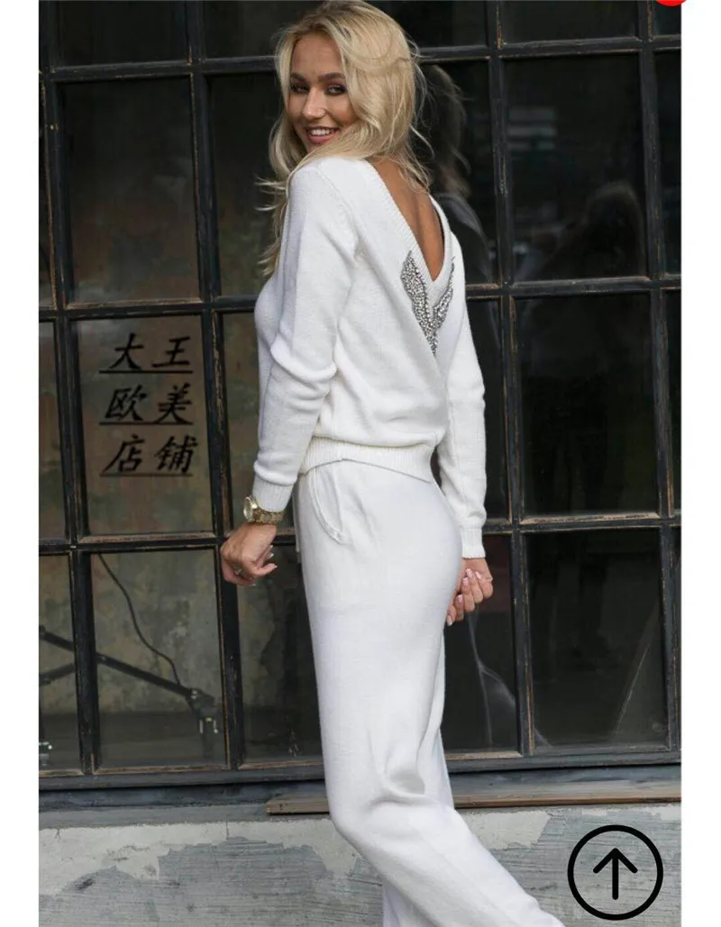 2020 Drawstring Wool New Women's Hot Sale 2 Piece Suit Knitted Mink Velvet Handmade Beaded Sexy V-neck Knit Two-piece Female