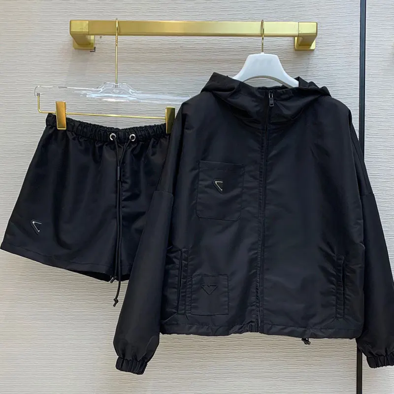 Black triangle metal embroidery drawstring elastic waist shorts with hooded jacket women's suit