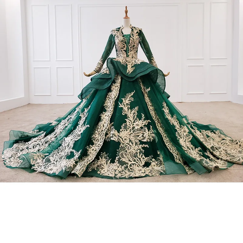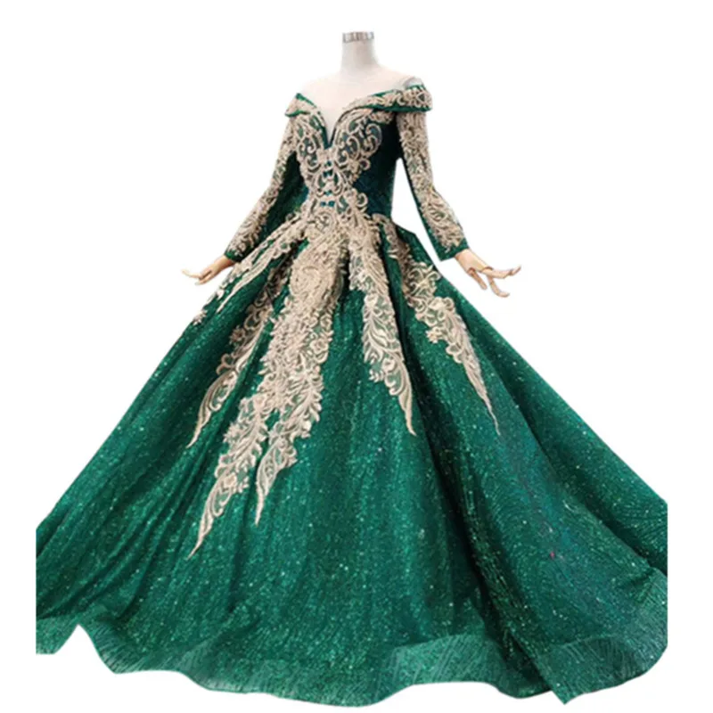 Buy BGW 2020 Green V Neck Evening Gown Long Sleeve Appliques Beads Ball Gown Saudi Arabi Вечерние Платьяc Evening Dress Lace Flowers and You will Save USD 632.49 or 55% %, Because You Just Pay for 517.49 not Full Price for 1149.98