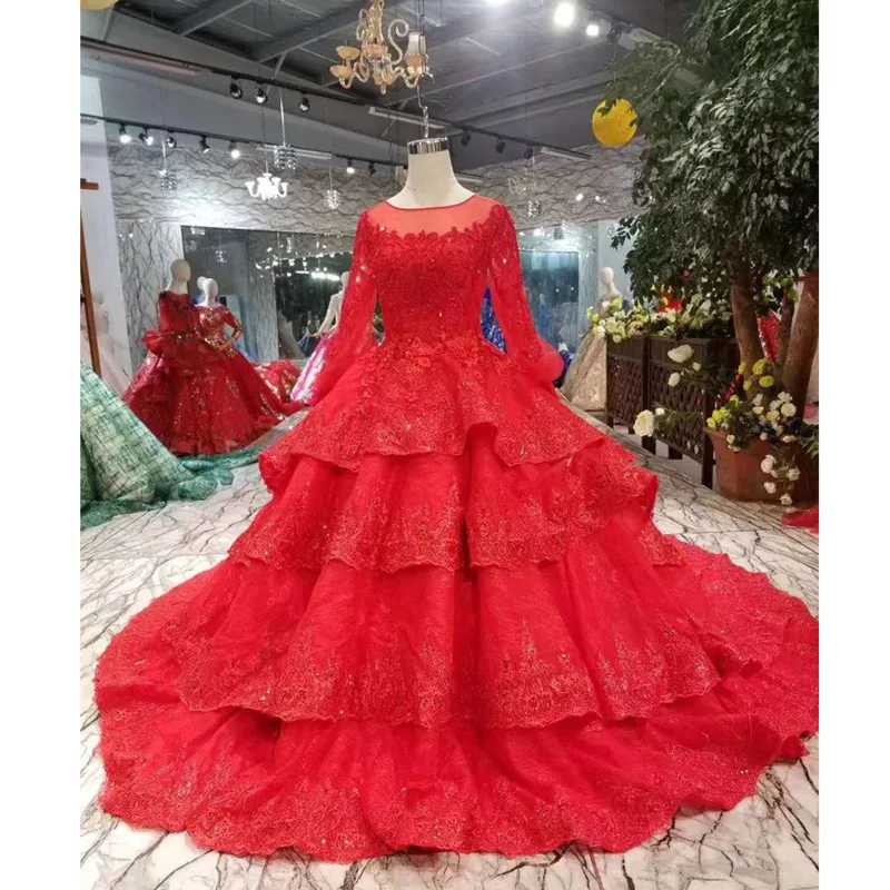 BGW 22713ht Ball Gown Red Bride Evening Dresses With Train O-neck Long Sleeve Wedding Party Dress Long 2020 New Vestidos De Gala