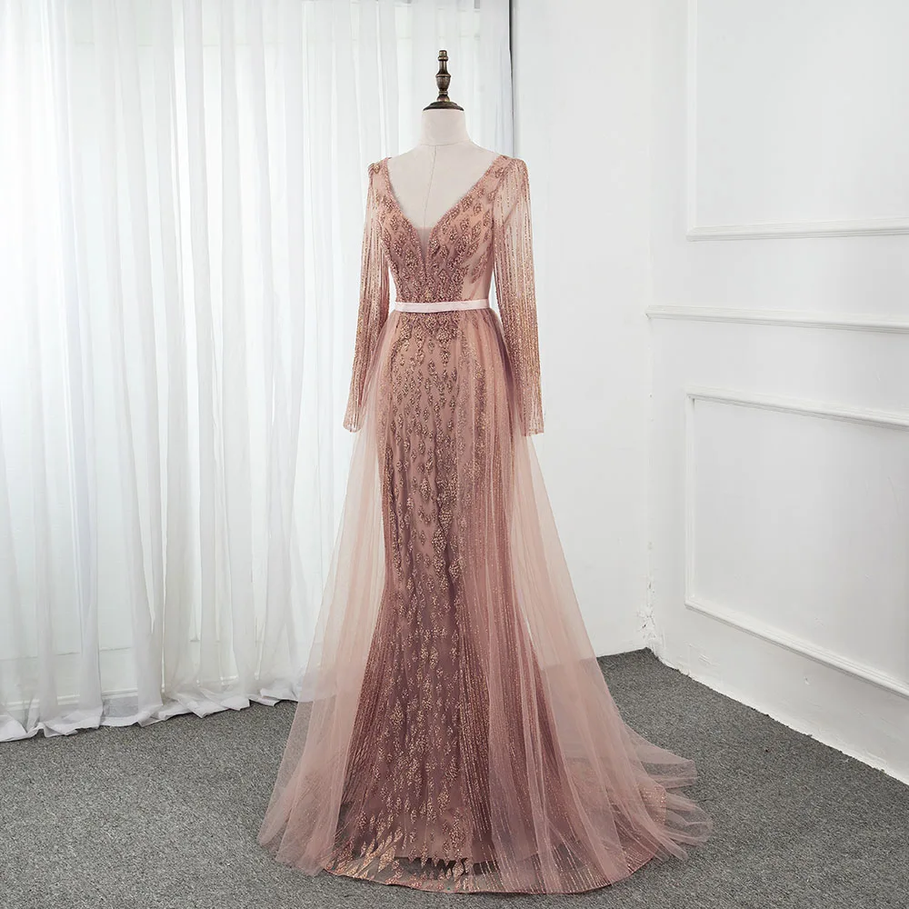 Cheap Offer of Fashionable sexy V-neck transparent mermaid evening dress golden full sleeve crystal banquet dress shiny lace dress