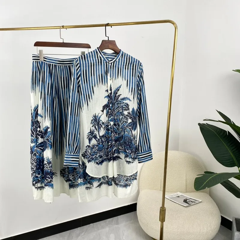 2021 Spring Women Fashion Top Quality Placing Print Long Skirt Suit for Elegant Long Sleeve Stand Collar Blouse