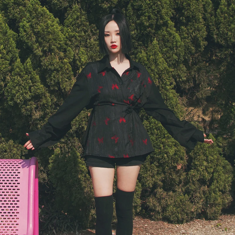 Addition Information of Woman Japanese Kimono Style Embroidered red Butterfly Print Shirt 2021 NEW Spring shirt Loose Top