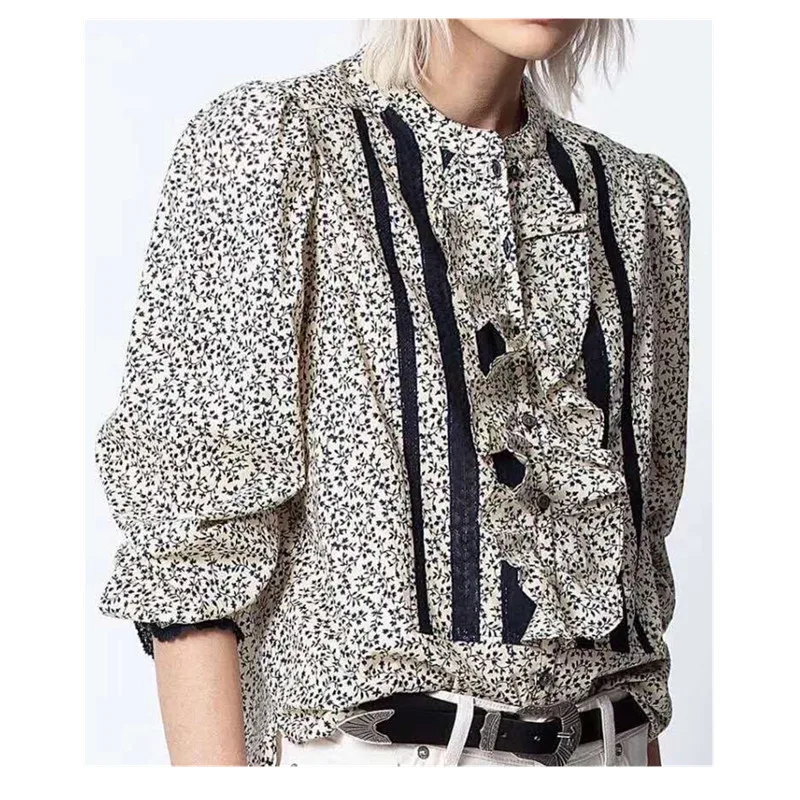 Addition Information of 2020 new light yellow floral stand collar ruffled lace trim long sleeve shirt