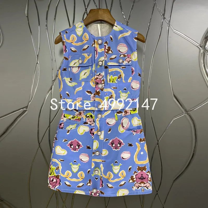2021 summer women print blue skirt set pearl button o-neck sleeveless single breasted top + mini pencil skirt 2 pieces set y620